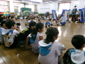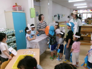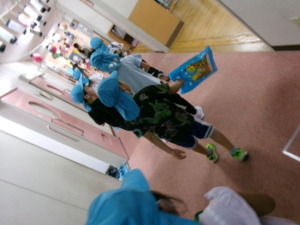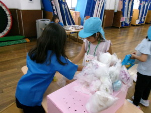 千葉駅保育園では自分たちで計画をし≪夏まつり≫を開催してきましたが、9月中旬に弁天こども園の≪わいわいまつり≫に招待してもらい、年長児が参加しました。初めはみんなで盆踊り!!ちょっぴり緊張していた子ども達ですが、知っている曲が流れ始めると笑顔全開に!大きな声で歌を歌いながら元気いっぱいに踊って全身で楽しさを表していました。そして、いよいよ出店スタート!スタンプラリー形式のカードを首に下げ自由に自分の行きたいコーナーへ走っていく子ども達。楽しみが溢れつい走ってしまうほど。金魚すくいやヨーヨー・スーパーボール!!そして大人気なくじ引きでは素敵な景品をGET!ですが同じ景品が当たり欲しかった物がもらえなかった子も・・・職員間でどうしようか相談をしていた最中、その姿を見て「交換してあげるよ」と優しい声が。職員が間に入る間もなく子ども達だけで解決している姿に子ども達の心の成長を感じました。そして最後にはアイスのプレゼントが!!そこでも3種類の味を巡り子ども達で相談。互いに譲り合う姿もあり年長ならでは姿をたくさん見ることのできた1日となりました。