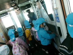 朝からワクワクが止まらない子ども達・・・「先生お弁当忘れてない?」と職員のお弁当の心配までしてくれる優しい子ども達です。いざモノレールに着き一人ずつ大切な1枚の切符を手にし改札を通ると、事前に話はしていたものの出てくる切符に驚いたり、切符に小さな穴が開いて返ってきたことや降車の時には行きとは逆に切符が出てこないことに「あれっ?」といった表情を見せたりと様々な発見があったようです。現代ではICカードが主流になってきていることもありとても貴重な経験になったのではないかと思います。